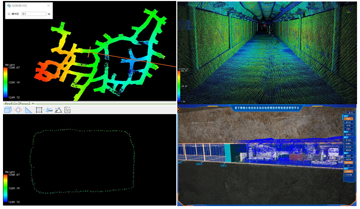 (2)巷道自动生成及形变监测:云GIS平台提取点云数据,自动更新巷道信息,包括迎头位置、导线及控制点信息、巷道方位、进尺等;平台对多次点云数据对比,剖切巷道任意断面得出空间形变量,为矿压监测、通风设计等提供数据支撑。