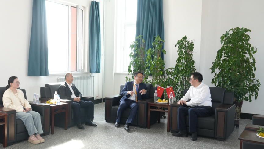 雷小平副总经理(右一)与地矿学院副院长刘洪林(右二)等座谈交流