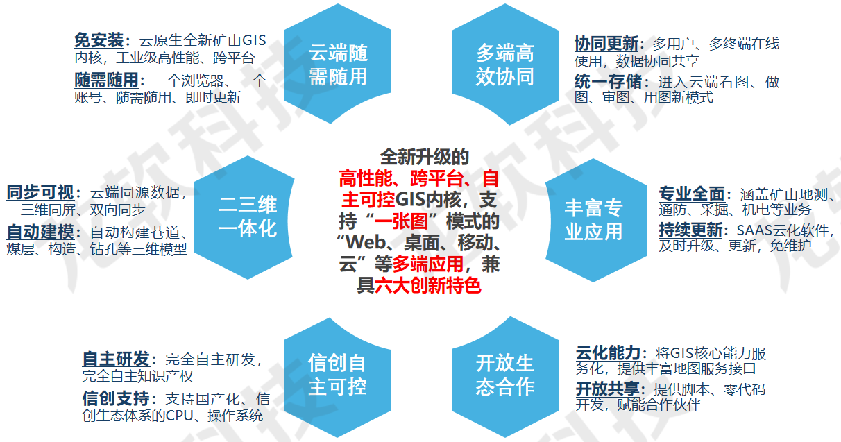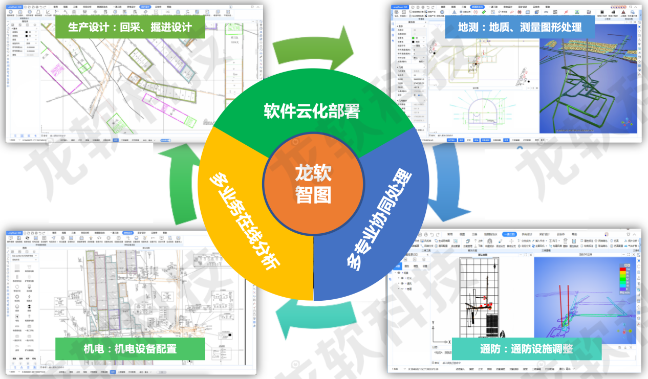 丰富专业应用:提供强大的GIS空间数据管理、地质建模、空间分析、服务发布与共享等能力,功能应用涵盖矿山地质测量、一通三防、机电设计、采矿设计等业务。