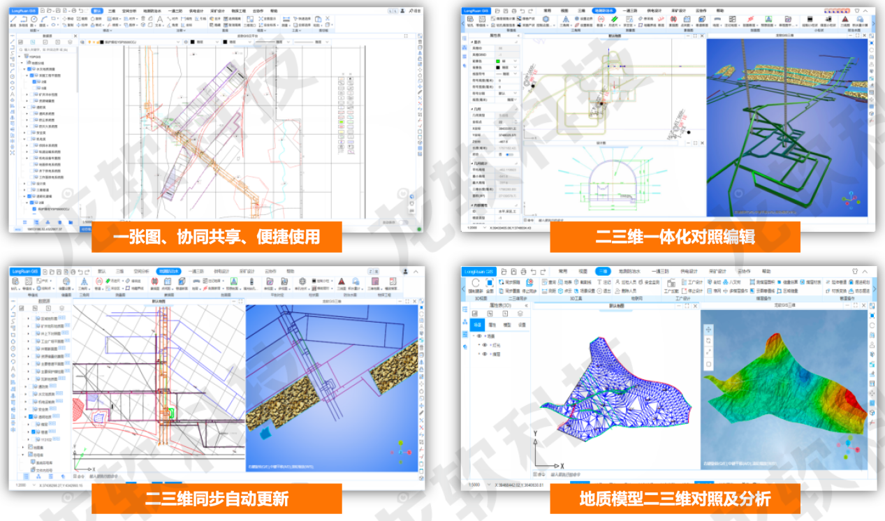 二三维一体化处理:基于云端同源数据,提供同屏、双向同步的二维、三维一体化应用,自动构建矿山巷道、煤层、构造、钻孔等各类三维模型,提供二三维同步跟随、对照编辑、自动更新等便捷应用。