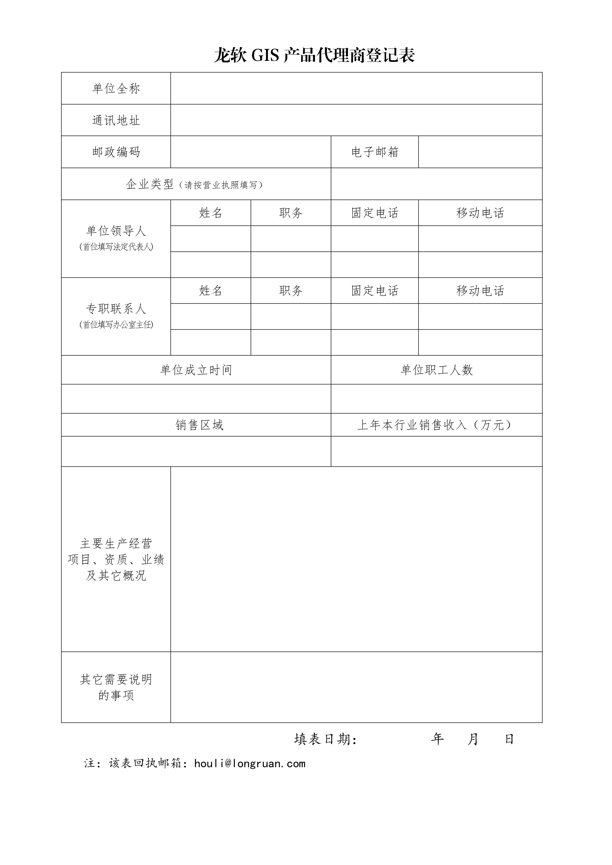 提交申请:请将您的基本信息、公司介绍、代理意向等(详见《代理商登记表》)发送至邮箱(houli@longruan.com)。