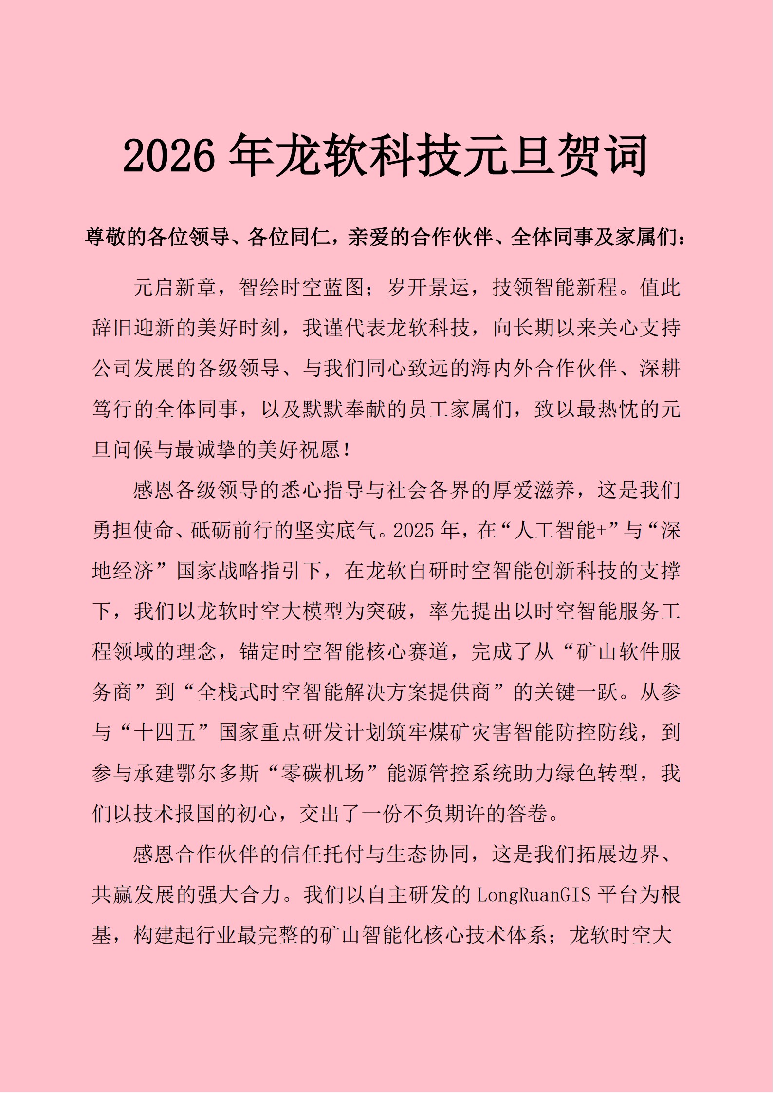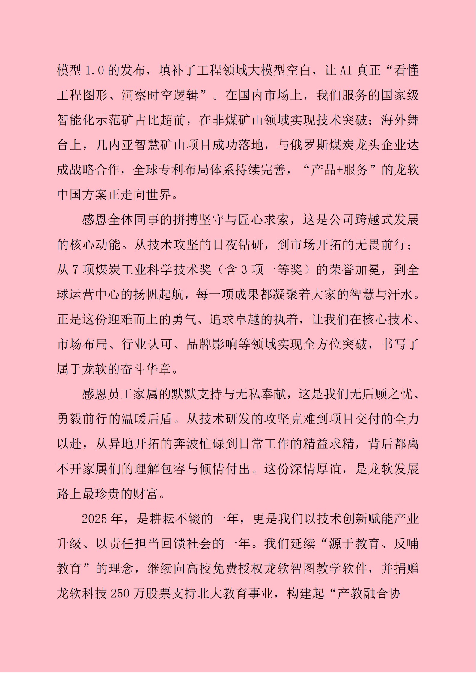 2025年,在“人工智能+”行动与“深地经济”国家战略的双重驱动下,公司完成了从“矿山软件服务商”到“全栈式时空智能解决方案提供商”的关键一跃。公司以全球首个工程领域时空大模型为技术锚点,在核心研发、市场拓展、行业认可、品牌传播及社会价值五大维度实现协同突破,不仅巩固了矿山智能化领域的领军地位,更构建起跨行业的“技术-产品-生态”全链条竞争优势。